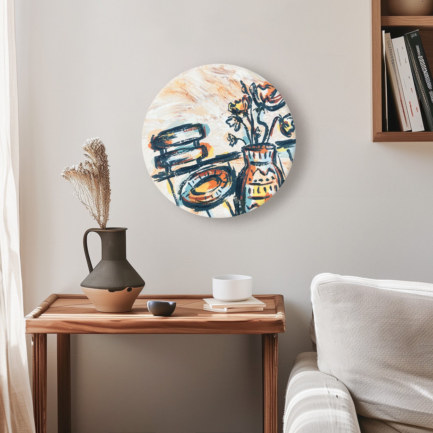 "Al Fresco" is an original painting with tones of lemon yellows, orange and cheerful blues.