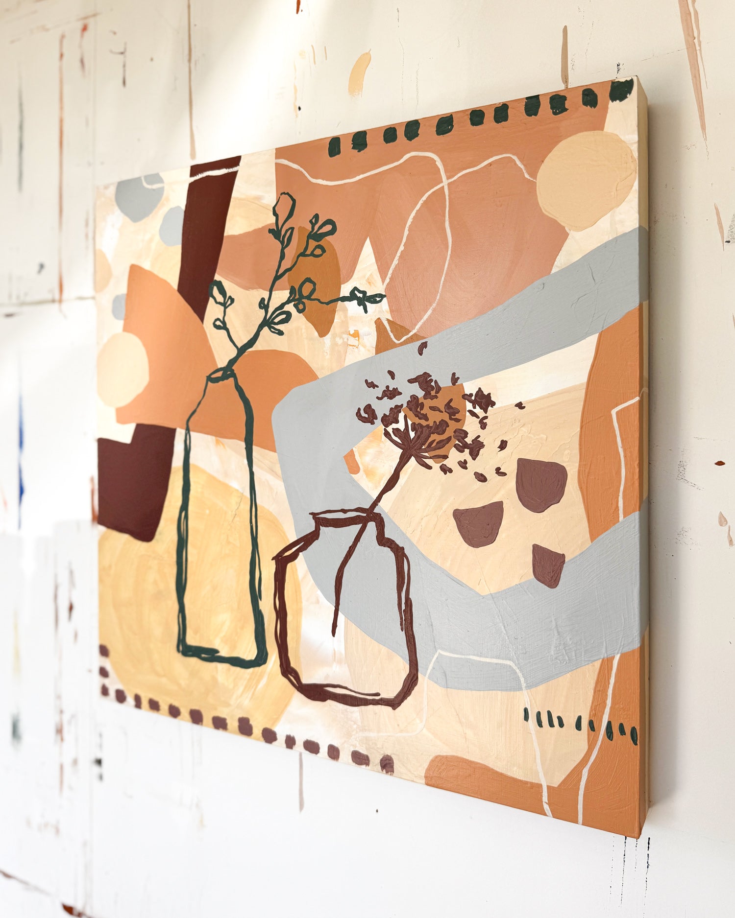 With a background of pastel pink, peach and blue, plus my signature base layer painting created with a textile squeegee. The main focus is the two vases with single stems in each. The soft base painting is complimented by the teal and purple flowers and vases.
