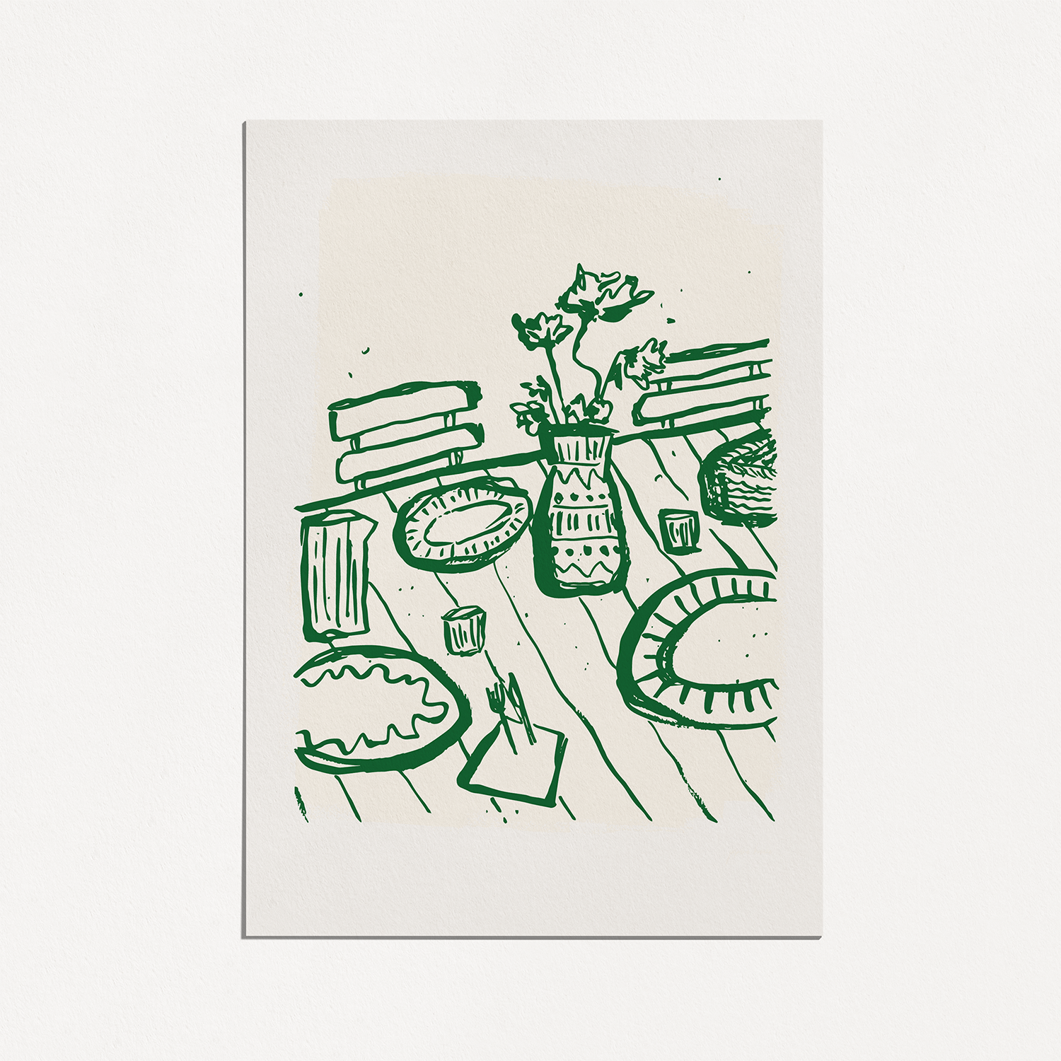 "Tales from the Table" is all about that unmistakable laid-back charm that only a summer gathering can bring. This design was born from my love for those moments, created with Indian ink and capturing the moment when you're just about to sit down with your favourite people.