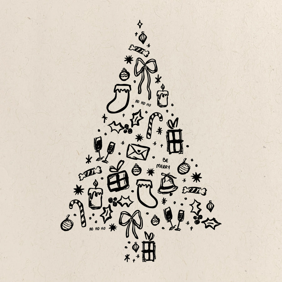 A playful twist on the classic Christmas tree. This design is made up of loose, hand-drawn doodles. You can spot baubles, bows, stockings, crackers and stars.. all within a Xmas tree shape. Relaxed and modern, it’s a great way to add some Christmas fun to your shop window.