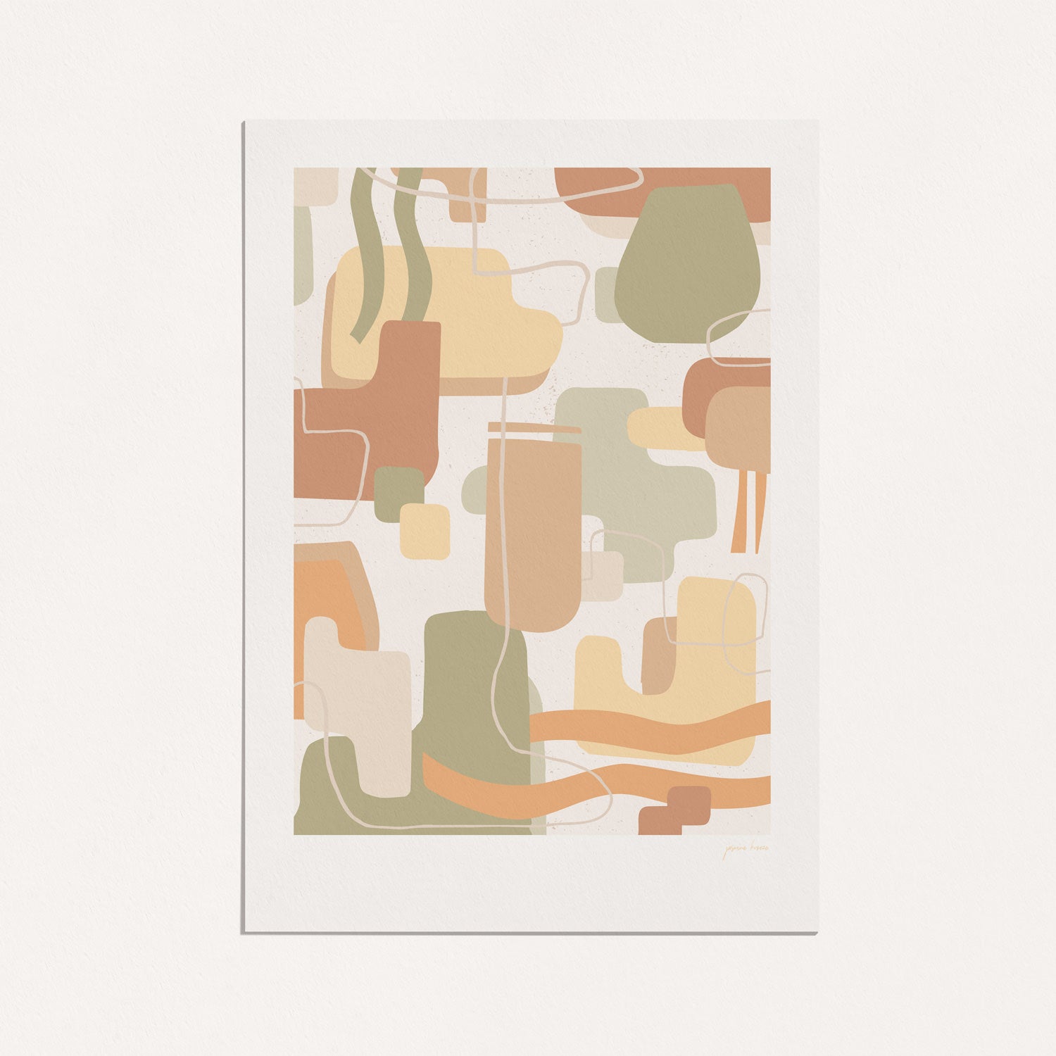 A refreshing geometric composition, with mindfully layered shapes. This art print features desert tones of dusty neutrals, subtle greens and pops of apricot and lemon yellow.