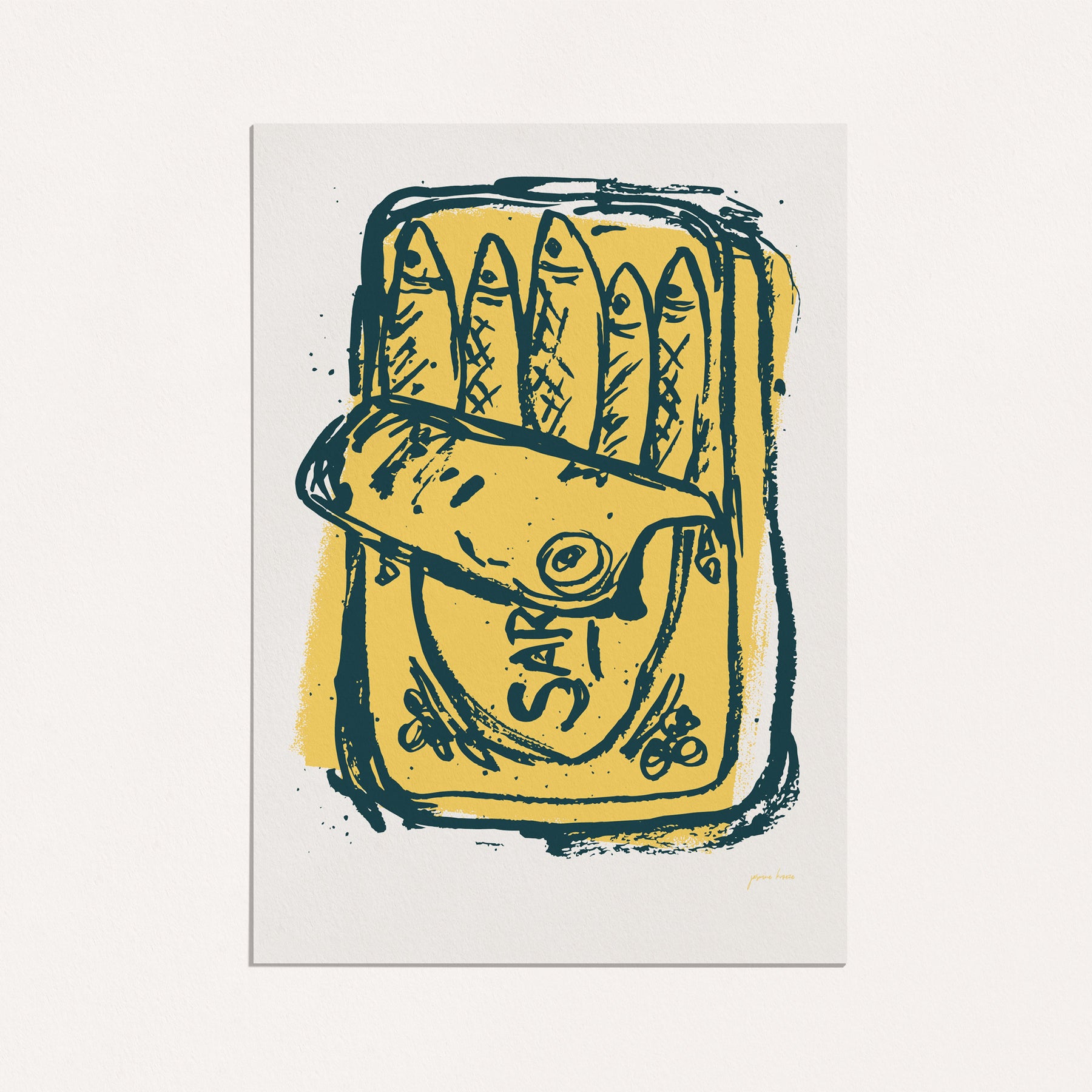 Featuring a playful print of a classic tin of sardines. Originally I drew this print in Indian ink. I love how it captures feelings of fun and nostalgia.