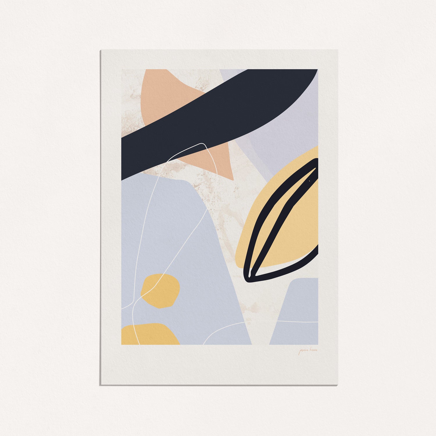 Cool blue and deep navy draws you into this abstract print. Inspired by my morning coffee and hints of sunrise tones in yellow, orange and pink.