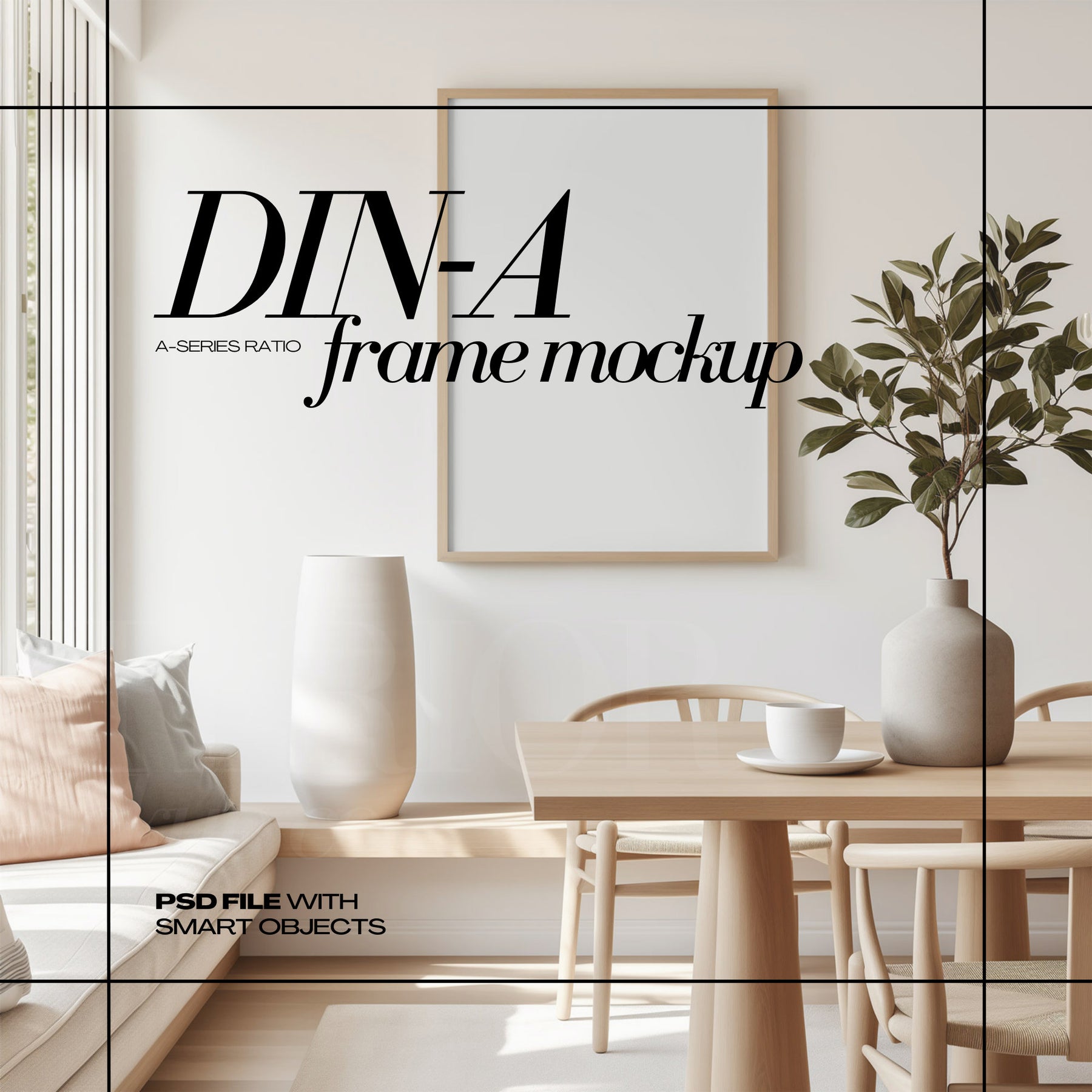 The interior scene features natural light with neutral tones and wooden floors in a modern dining room.