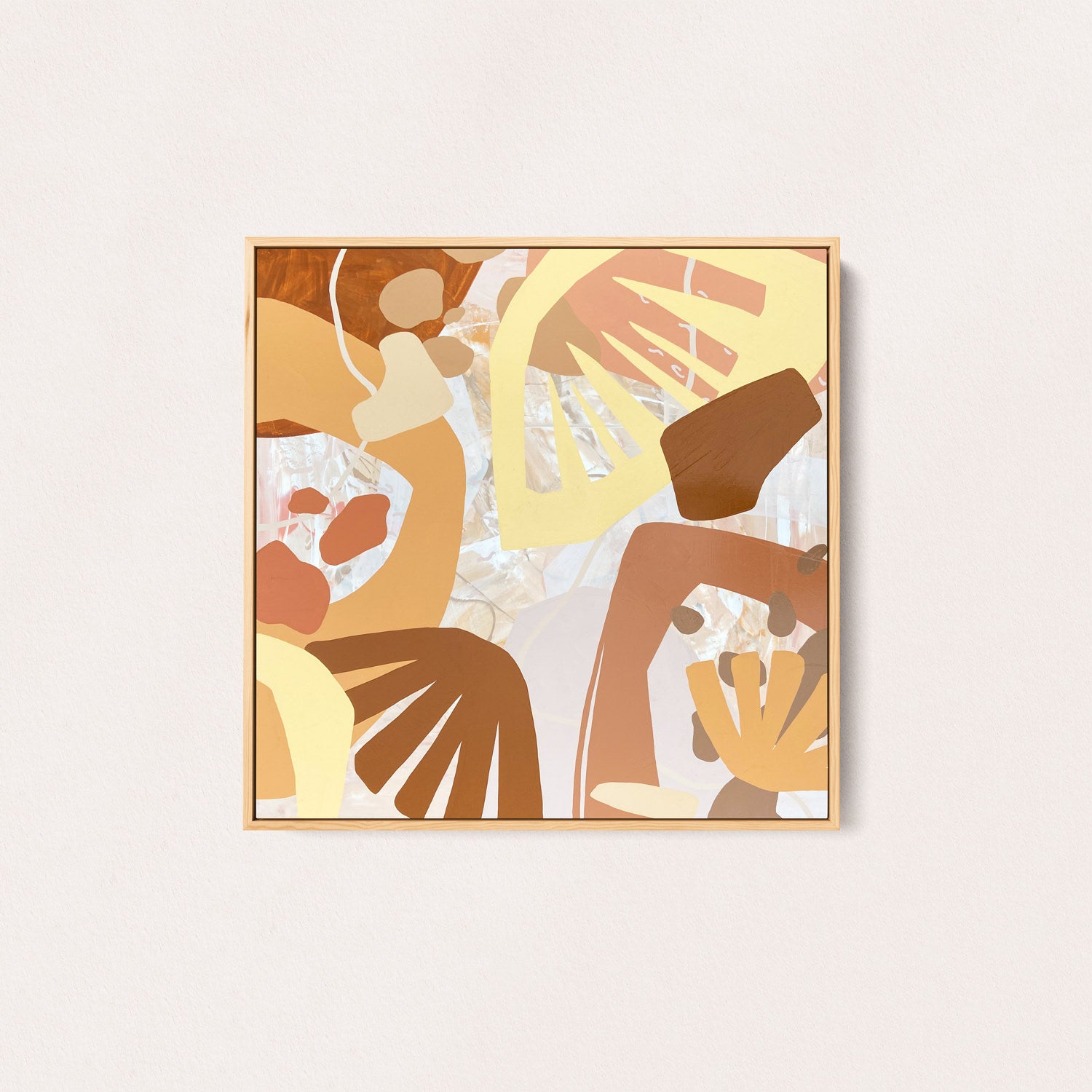 Peek through the delightful abstract shapes and discover the layers of uplifting tones. Rich in texture and bold in form featuring bold hues of apricot, terracotta and a creamy yellow. Inspired by my hand cut paper collage compositions, this original explores shape, scale and layering.