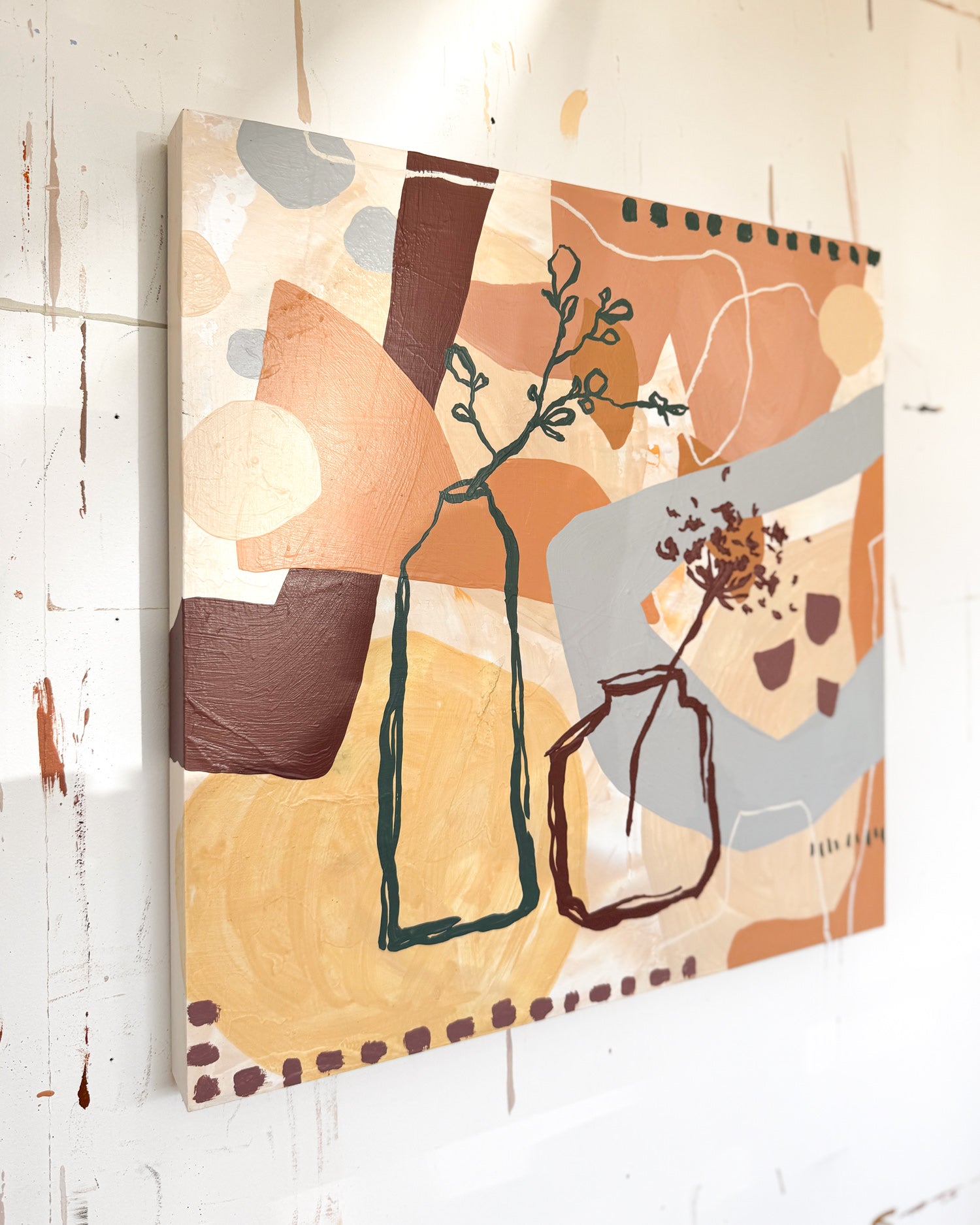 With a background of pastel pink, peach and blue, plus my signature base layer painting created with a textile squeegee. The main focus is the two vases with single stems in each. The soft base painting is complimented by the teal and purple flowers and vases.